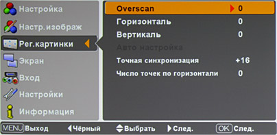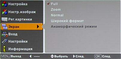 Включение режима Анаморфический немного растягивает картинку по вертикали так, что полосы при формате 2,35:1 уходят за область проекции, при этом для восстановления правильных пропорций нужно использовать опциональный анаморфотный объектив. В режимах Zoom и Анаморфический изображение можно перемещать вверх-вниз, чтобы, например, на экран поместились субтитры. При некоторых видах сигналов часть режимов недоступна. Если параметр Overscan больше 0, то картинка немного увеличивается так, что часть периметра изображения на экран не выводится.