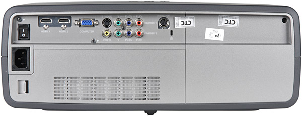 Там же — выключатель питания, а под ним — стандартный трехштырьковый разъем питания. ИК-приемник только один — за круглым окошком рядом с объективом. Передние вывинчивающиеся из корпуса ножки помогут немного приподнять проектор и устранить небольшой перекос при настольном размещении. Для крепления к кронштейну в днище проектора вделаны 3 металлические вставки с резьбой. Отметим, что для замены фильтра и лампы, проектор не нужно снимать с кронштейна, так как крышки фильтра и лампового отсека находятся на задней панели. Правда, крышечка, скрывающая отверстия для чистки матриц от пыли, расположена на днище.