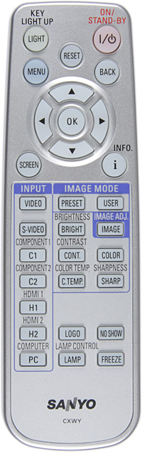 Пульт перешел от предыдущей модели. Он относительно небольшой. Кнопок много, некоторые для большей ясности подписаны дважды — на кнопке и рядом, чуть длиннее. В большинстве случаев, чем разбираться какая кнопка вызывает нужную функцию, проще воспользоваться меню. Самые важные кнопки довольно крупные, расположены они удобно, и ориентироваться в них легко. Есть яркая и равномерная светодиодная подсветка, включающаяся фосфоресцирующей кнопкой LIGHT. Проектору и пульту можно присвоить один из двух кодов. Пульт управляет проектором только с совпадающим кодом.