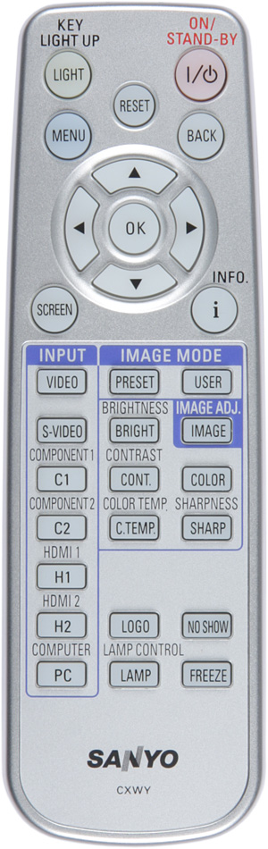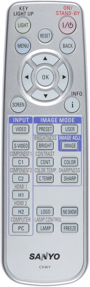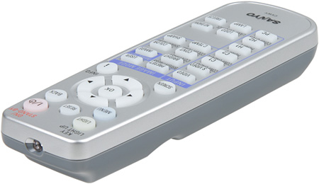 Есть яркая и равномерная светодиодная подсветка, включающаяся фосфоресцирующей кнопкой LIGHT. Проектору и пульту можно присвоить один из двух кодов. Пульт управляет проектором только с совпадающим кодом.
