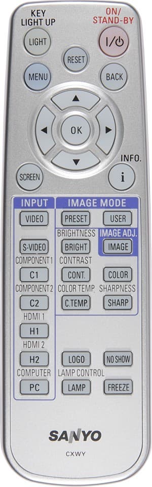 Пульт относительно небольшой — 54×26,3×173 мм, 95,5 г с батарейками. Кнопок много, некоторые зачем-то подписаны дважды — на кнопке и рядом, чуть длиннее. В большинстве случаев, чем разбираться какая кнопка вызывает нужную функцию, проще воспользоваться только навигационными и расположенными около них кнопками и меню. Есть достаточно яркая и равномерная светодиодная подсветка, включающаяся фосфоресцирующей кнопкой LIGHT. Проектору и пульту можно присвоить один из двух кодов. Пульт управляет проектором только с совпадающим кодом.