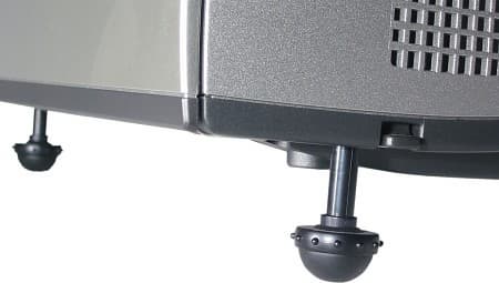 Снизу расположены две передние выдвижные ножки и одна задняя. Регулировать положение проектора просто: Вы приподнимаете проектор на требуемый угол и нажимаете на фиксаторы ножек, они выпадают на нужную высоту, а окончательное выравнивание осуществляется вращением ножки за ободок с выступами. Ножки с виду надежные, а резиновая полусфера на передних и резиновая же нашлепка на задней не позволяют проектору скользить на гладких поверхностях. На нижней плоскости корпуса есть 3 резьбовых отверстия для крепления проектора к кронштейну.