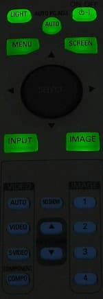 Пульт не очень большой и довольно легкий (по паспортным данным: размеры — 47x30x159 мм, вес — 125 г с батарейками). Так же как и в случае с проектором корпус пульта изготовлен из матовой серебристо-серой и темно-серой пластмассы, а кнопки из пластика, на ощупь напоминающего резину, притом все, кроме большой круглой, полупрозрачные. В руке лежит удобно, благодаря небольшой выемки снизу под указательный палец, и перехватывать, чтобы дотянуться до любой кнопки практически не надо. Кнопки хорошо дифференцированы и легко (по крайней мере основные) находятся на ощупь. Центральная кнопка служит для навигации в меню (отклонения вправо-влево и вверх вниз) и для выбора (нажатие в центр). При этом все положения четко разделены и усилие нажатия подобрано оптимально. Кнопка LIGHT на 10 секунд включает зеленую подсветку, но только для верхней группы кнопок. Подсветку отключить раньше повторным нажатием на туже кнопку нельзя. Кнопки в нижней части пульта некоторое время после яркого освещения фосфоресцируют слабым синим свечением.
