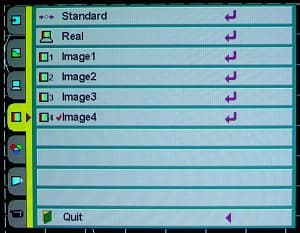 Установки сохраняются в 4 пользовательских профилях (Image 1-4). Встроенные профили Standard, Cinema (подключение к входам группы VIDEO IN) и Real (подключение COMPUTER IN) изменению не поддаются, но их можно взять за основу своего профиля.
