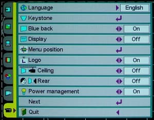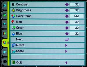 Меню состоит из 6 главных страниц (при VGA-подключении добавляется страница с настройками под RGB-сигнал), выбираемыми с помощью закладок слева. Навигация осуществляется 6 кнопками (MENU, SELECT и 4 стрелки, последние пять на пульте замещает одна кнопка-джойстик). Желтая подсветка обозначает текущее положение, а пиктограммы подсказывают какие кнопки следует нажать, для выбора пункта, следующего уровня или изменения параметра. Страницы установок, настройки изображения и настроек под RGB-сигнал разбиты на 2-3 подстраницы, и, чтобы изменить некоторые параметры, приходится долго до них добираться. Выбор ряда опций приводит к автоматическому выходу из меню, хорошо хоть при повторном входе в меню Вы оказываетесь на странице, которая была активной в прошлый раз. Иногда хочется нажать стрелку, а надо — SELECT, и наоборот. Удобно то, что любое изменение параметров, которые могут принимать несколько значений, автоматически убирает меню с экрана, остается только небольшая полоска, чтобы проще было оценить влияние регулировки.