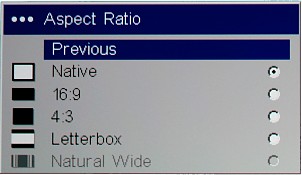 Режимов трансформации изображения всего 5: Native (изображение выводится 1:1, без интерполяции к разрешению матрицы), 16:9 (картинка растягивается на весь экран 16:9, идеально для анаморфированных фильмов), 4:3 (картинка вписывается в экран по высоте с сохранением пропорций 4:3), Letterbox (картинка вписывается в экран по ширине) и Natural Wide (картинка растягивается на весь экран 16:9, но так, что центральная часть искажается меньше).