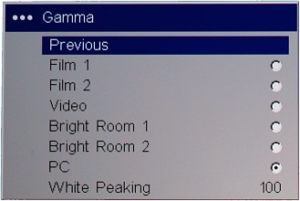 Это — контрастность, яркость, насыщенность (нет в PC-режиме), оттенок (только для NTSC-сигнала) и коррекция гамма-кривой (6 предустановленных профилей и ручная регулировка яркости светлых оттенков).