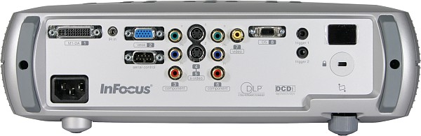 С композитным, парой S-Video и двумя наборами компонентных все очевидно, а вот на входы M1-DA, VESA (D-sub 15 pin) и D5 можно подать несколько типов сигналов. Разъем D5 пришел из профессионального видео. Этот вход понимает компонентные RGB-сигналы от SDTV до HDTV (в комплект поставки входит переходник с разъема D5 на SCART-female). Вход VESA совместим с компьютерными VGA-сигналами (вплоть до разрешения 1280×1024 пикселей) и компонентными (Y/Cb/Cr и Y/Pb/Pr). "Фирменный" разъем M1-DA — мастер на все руки. Во-первых, на него можно подавать компонентные цветоразностные и RGB-сигналы, во-вторых, он воспринимает цифровой видеостандарт DVI (и совместим с HDCP), т. е. к проектору можно подключать видеотехнику с разъемом HDMI, и, в-третьих, у InFocus есть беспроводные модули, подключающиеся к разъему M1-DA. Пока эти модули имеют невысокую скорость передачи данных, и пригодны только для проведения презентаций, но, в будущем возможно появления высокоскоростных модулей, способных передавать живое видеоизображение. Минус у разъема M1-DA только один — чтобы его задействовать понадобятся "фирменные" переходники.