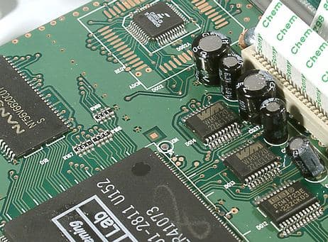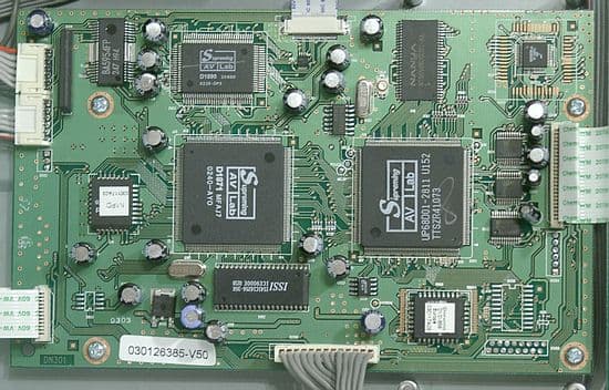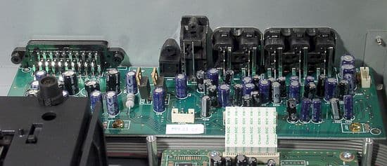 Сзади находится плата аналоговой интерфейсной части. Поражает обилие электролитических конденсаторов, которые как известно, портят звук и увеличивают шум. Передача аудио и видео сигналов по одному шлейфу способствует возникновению наводок на аудиосигнал.
