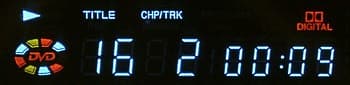 На передней панели справа от DVD-привода находится только кнопка Power, которая на самом деле является кнопкой включения-выключения режима stand by. Трей для загрузки дисков позволяет использовать 8 и 12 см диски. Снизу от трея находится многофункциональный цветной VFD-дисплей. Он имеет функцию регулировки яркости (полная, половинная и выключен), которая доступна с пульта ДУ. VFD-дисплей служит для индикации времени воспроизведения, режима воспроизведения, типа воспроизводимого диска, режима декодера объемного звука. Надписи на дисплее светятся ярко и прекрасно читаются под любым углом зрения даже в хорошо освещенном помещении.