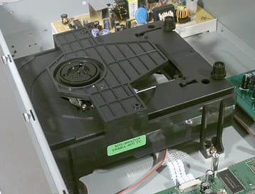 На передней панели находятся платы контроллера сенсорного управления и VFD-дисплея. Особенностью конструкции является отсутствие выключателя питания. Схема блока питания все время находится под напряжением, отключить плеер от питающей сети можно только вынув вилку из розетки. Справа от DVD-привода находится основная плата электроники плеера, плата собрана аккуратно, качественно.