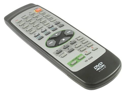 Пульт управления VD-5308, судя по названию, разработан специально для данной модели плеера. Дизайн пульта своеобразен, имеются разноцветные кнопки разных форм, сформированные в группы по функциям. Но мне видится неудобным, что навигация по меню осуществляется отдельным блоком из четырех клавиш. Кроме того, не удалось найти на пульте кнопку Eject. Во всем остальном пульт работает хорошо, кнопки нажимаются четко, сигнал пульта распознается плеером уверенно.