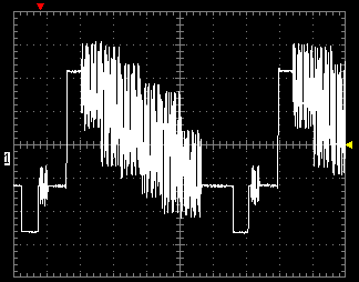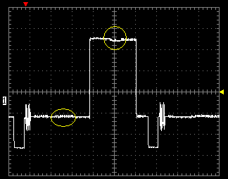 Вторая осциллограмма показывает уровень шума ЦАПа плеера. Тестовая картинка содержит черное и белое поле, имеющие вертикальные полосы с отклонением яркости в 1%. Желтым цветом на осциллограмме отмечены места расположения полос.