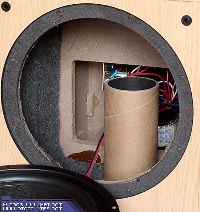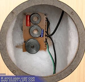 Помимо внешних атрибутов «взрослой» конструкции, есть ещё и подтверждения внутри АС, где можно лицезреть поперечную раму жёсткости и немалое количество звукопоглотителя на стенках. Да и динамики используются вполне приличные: высокочастотник имеет дюймовый тканевый купол, а НЧ/СЧ динамики оборудованы полимерным диффузором с подвесом из мягкой резины. Так на чём же серьёзно сэкономили, спросите? Надо сказать, что явных проявлений наплевательского отношения к конструкции найти не удалось. Единственное, что вместо MDF для изготовления корпуса используется прессованный картон (толщина листа 12 мм), который заметно дешевле. По акустическим свойствам такой материал хоть и уступает MDF, однако вполне подходит для построение корпусов. Главное, что всё сделано на совесть — и сам корпус, и отделка плёнкой.