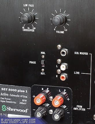 Задняя панель открывает доступ ко всем типам подключения. Вход SUB WOOFER позволяет подать сигнал на встроенный усилитель в обход внутреннего фильтра сабвуфера. Это удобно, если фильтрацией занимается кроссовер AV-ресивера. В этом случае можно добиться хорошего согласования сабвуфера и колонок. Вход LINE (стереофонический) пригодится при подключении не фильтрованного полнодиапазонного сигнала. Например со стереофонического выхода предварительного усилителя или «петли» на запись. И, наконец, возможно пассивное подключение, когда используется внешний усилитель мощности. Для этих целей предусмотрены винтовые клеммы с возможностью подключения разъёмов «банан».