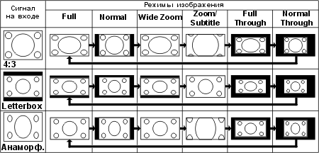 Когда источником видеоизображения не является компьютер, тогда доступны 7 режимов трансформации изображения. Они последовательно перебираются кнопкой WIDE MODE на пульте или в меню. Переключение режимов происходит утомительно медленно. Таблица ниже дает представление о том, как они работают.