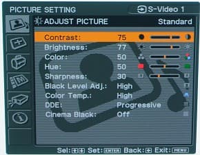 При подключении к компьютеру (RGB-VGA или DVI-D) и при просмотре содержимого Memory Stick добавляются следующие два параметра: RGB Enhancer (меняет резкость изображения) и Gamma Mode (два значения — Graphics, соответствует «нормальной» гамме, и Text, при котором контраст максимален). В случае некомпьютерного видеоисточника имеется возможность настроить насыщенность (Color), оттенок (Hue), резкость (Sharpness), уровень черного (Black Level Adj., три значения — High, Low и Off) и режим чересстрочного преобразования (параметр DDE, принимает значения Off (выключен), Progressive (работает преобразование в прогрессивный сигнал) и Film (работает преобразование в прогрессивный сигнал и пересчет 3-2, который необходим для корректного воспроизведения фильмов, полученных с кинопленки). В общем-то и все. Никаких тонких настроек гаммы и цветового баланса, уже ставших обычными для кинотеатрального проектора. Предустановленных профилей всего три (Dynamic, Standard и Cinema) и пользовательских тоже три (User 1-3). Впрочем предустановленные тоже настраиваются. Профили загружаются через меню (пункт Picture Mode) или кнопками на пульте (группа PICTURE MODE).