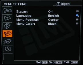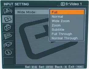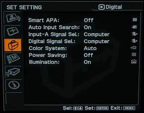 Все 8 источников изображения последовательно перебираются кнопками INPUT на пульте или на проекторе. Переключение происходит с некоторой задержкой, поэтому легко промахнуться. Тогда придется пролистывать список сначала. Эти источники обозначены как: Video 1 (композитный), S-Video 1, Input-A, Video 2 (композитный), S-Video 2, Component (компонентный), Digital (DVI-D)и MS (Memory Stick). Источники с цифрой 2 и Input-A относятся к разъему PJ multi. Режим работы (VGA-RGB, компонентный или видео-RGB) источника Input-A указывается в меню SET SETTING (параметр Input-A Signal Sel.).
