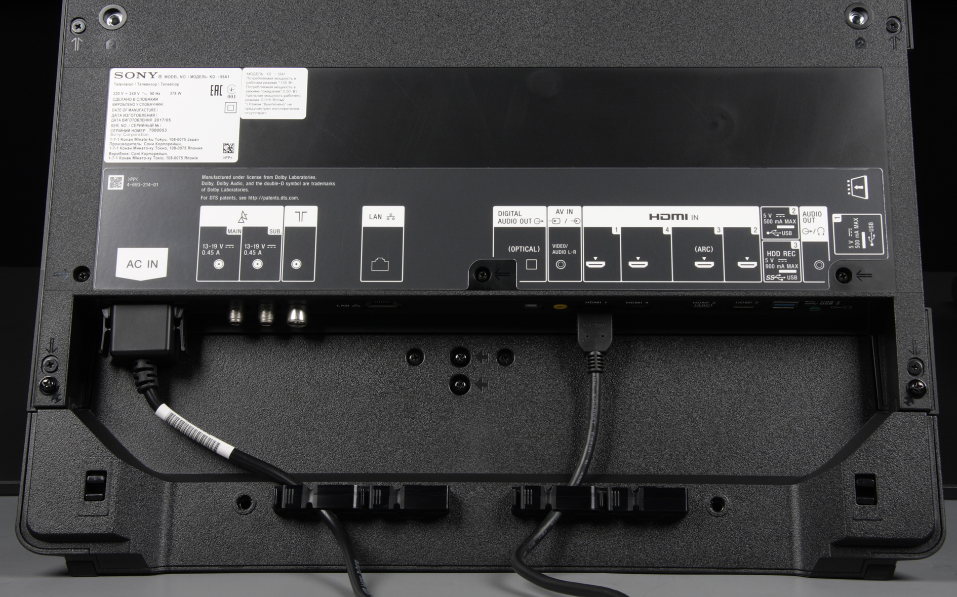 Большинство разъемов расположено в нише сзади внизу и ориентировано вниз. За крышкой на боковой грани находятся один из трех портов USB и разъем для карты CAM. Крышка эта снимается с большим усилием, кажется, что вот-вот и отломится один из ее фиксаторов. Выше этой крышки есть кнопка питания и кнопка-качалка, с помощью которых можно очень ограниченно управлять телевизором без использования пульта ДУ и других внешних устройств.