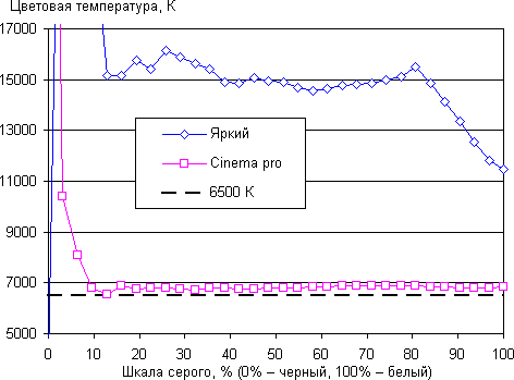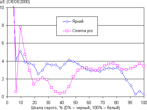 Графики ниже показывают цветовую температуру на различных участках шкалы серого и отклонение от спектра абсолютно черного тела (параметр ΔE) для профиля Cinema pro, в котором с нашей точки зрения цветопередача максимально близка к стандартной, и для профиля Яркий с самой яркой и сочной картинкой: