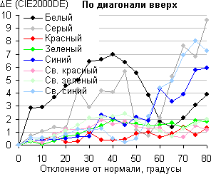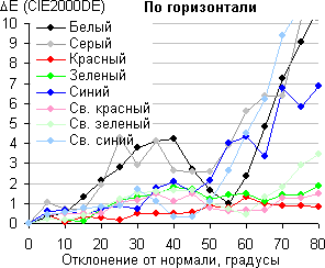В качестве реперной точки можно выбрать отклонение в 45°. Критерием сохранения правильности цветов можно считать значение ΔE меньше 3. Из графиков следует, что при взгляде под углом основные цвета и их светлые оттенки меняются несущественно, чего не скажешь про белый и серый цвета. Действительно, при выводе белого поля во весь экран или на очень большой неразрывной площади видно, что белый цвет даже при не очень большом отклонении заметно розовеет или синеет. Однако на типичных реальных изображениях, которые обычно выводятся на бытовом телевизоре, заметить изменение оттенка белого практически невозможно, так как большие белые поля встречаются нечасто и не демонстрируются продолжительное время.