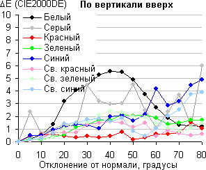 Для количественной характеристики изменения цветопередачи мы провели колориметрические измерения для белого, серого (127, 127, 127), красного, зеленого и синего, а также светло-красного, светло-зеленого и светло-синего полей во весь экран с использованием установки, подобной той, что применялась в предыдущем тесте. Измерения проводились в диапазоне углов от 0° (датчик направлен перпендикулярно к экрану) до 80° с шагом в 5°. Полученные значения интенсивностей были пересчитаны в отклонение ΔE относительно замера каждого поля при перпендикулярном положении датчика относительно экрана. Результаты представлены ниже: