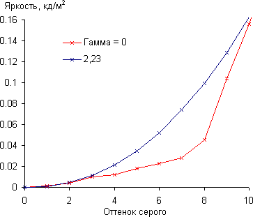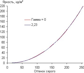 Вообще для темных оттенков хотелось бы иметь линейный рост яркости, как предусмотрено стандартом sRGB. Аппроксимация полученной гамма-кривой дала показатель 2,23, что близко к стандартному значению 2,2, при этом реальная гамма-кривая на большей своей части мало отклоняется от аппроксимирующей степенной функции:
