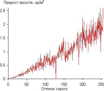 Для оценки характера роста яркости мы измерили яркость 256 оттенков серого (от 0, 0, 0 до 255, 255, 255) при выборе профиля Cinema pro и Гамма = 0. График ниже показывает прирост (не абсолютное значение!) яркости между соседними полутонами: