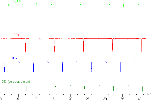 На любом уровне яркости видимое мерцание отсутствует, его не выявляет и тест на стробоскопический эффект. Регистрация зависимости яркости от времени при различных уровнях яркости выявила модуляцию яркости с очень высоким коэффициентом заполнения, что и объясняет отсутствие мерцания. В доказательство приведем графики зависимости яркости (вертикальная ось) от времени (горизонтальная ось) при различных значениях настройки Яркость в режиме Яркий в случае белого поля примерно на 15% от площади экрана, если не указано иное.