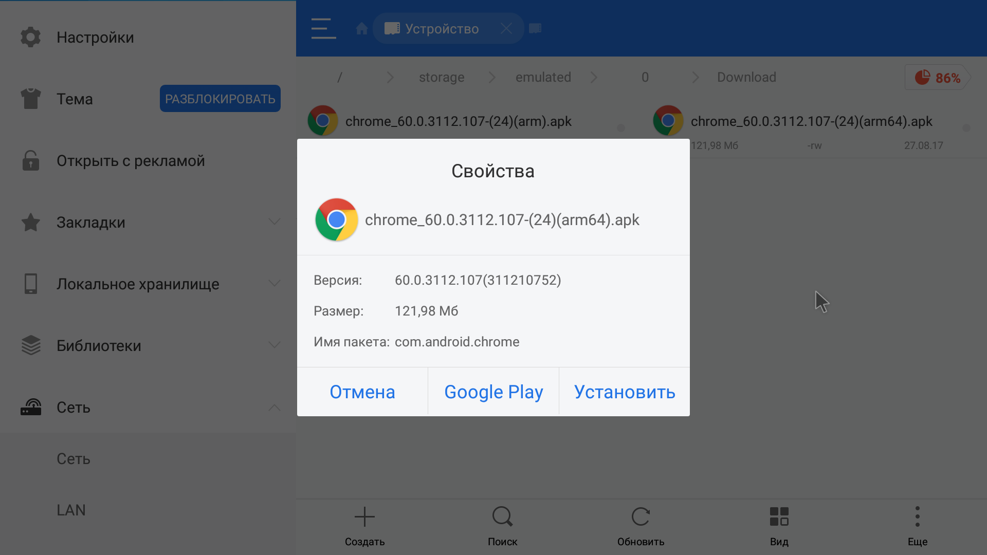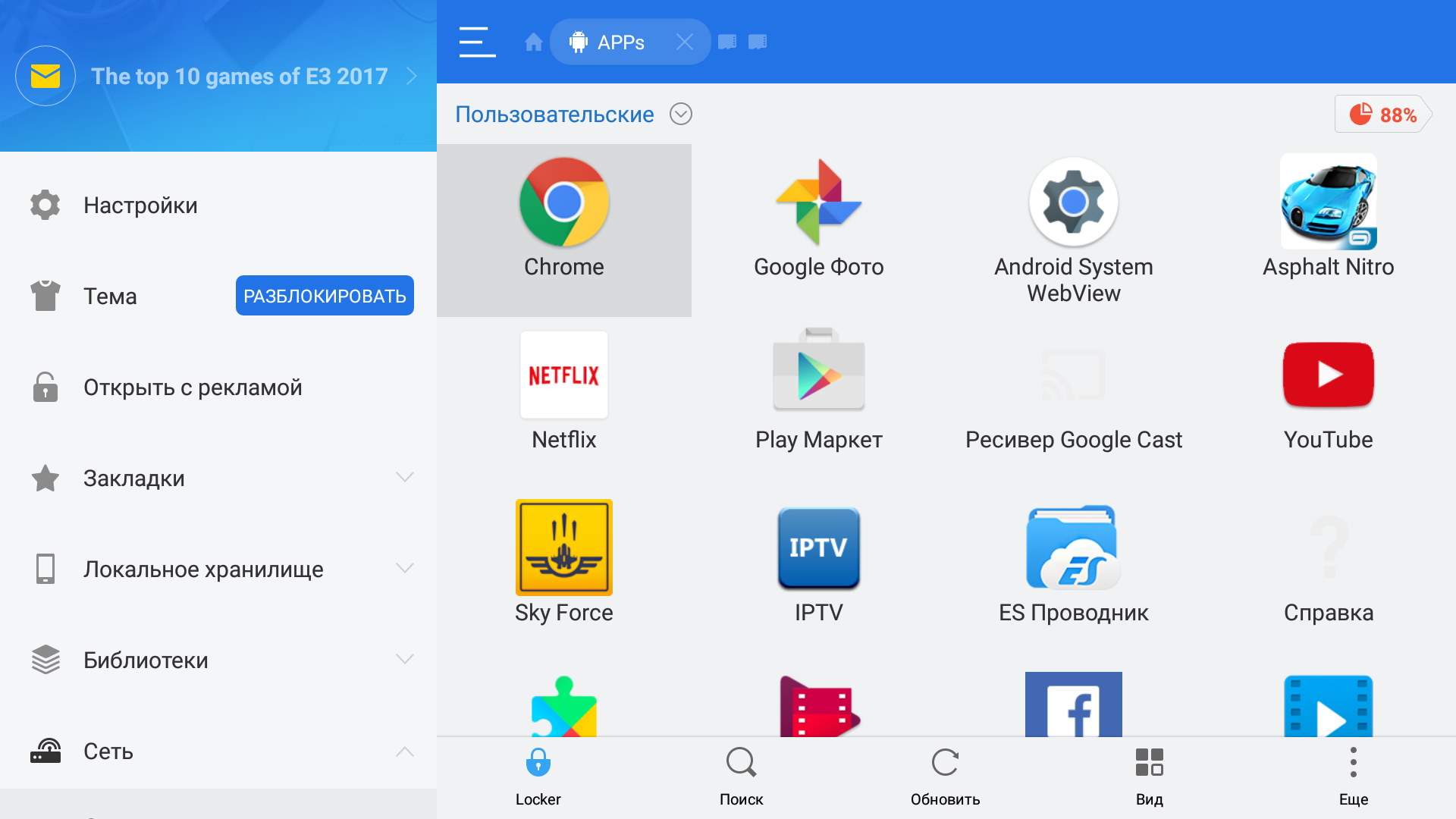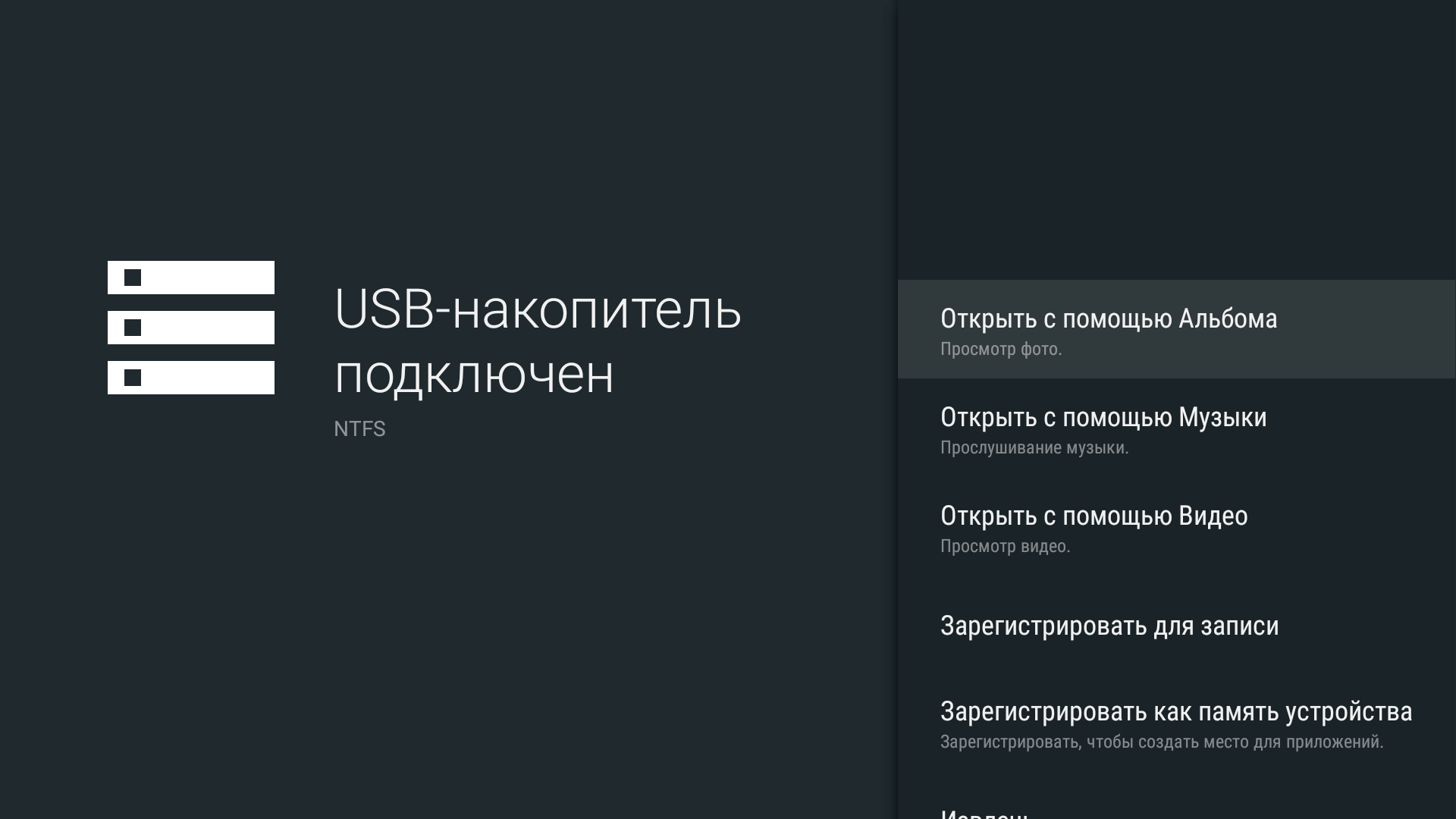 Приложения можно устанавливать на внешний USB-накопитель, для чего его предварительно нужно зарегистрировать. USB-накопители с данными монтируются автоматически, но их подключение может перехватывать ES проводник (если он установлен), что не всегда удобно, так как доступ к файлам с его помощью имеет некоторые ограничения.