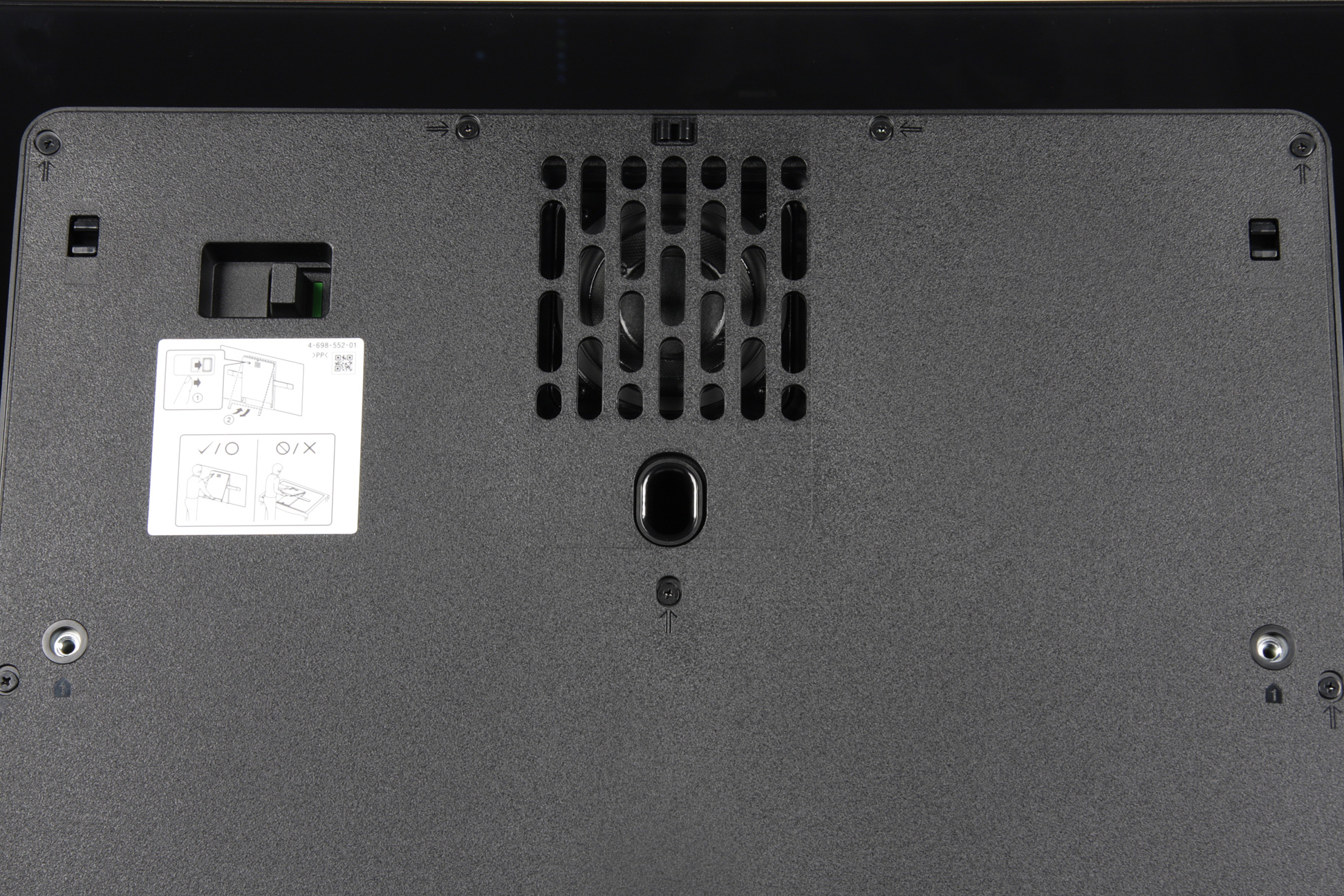 От той части корпуса, что остается на задней панели, вертикально по центру вправо и влево отходят планки из алюминиевого сплава и с черной матовой поверхностью. Ближе к краям эти планки прижимают к задней панели экрана акустические приводы.