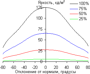 Отметим очень плавное уменьшение яркости при отклонении от перпендикуляра к экрану во всех трех направлениях, при этом графики яркости полутонов не пересекаются во всем диапазоне измеряемых углов. Для сравнения — в случае типичного ЖК-телевизора на матрице VA яркость падает вдвое уже примерно при 30°.