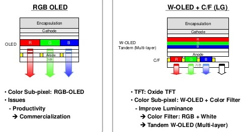Несмотря на различия в технологиях, W-OLED+C/F все равно имеет те же основные преимущества, а это, прежде всего, возможность получить абсолютно черный цвет на площади одного пикселя независимо от состояния других пикселей, как и у RGB OLED, при этом матрицы с W-OLED+C/F проще и дешевле в производстве.