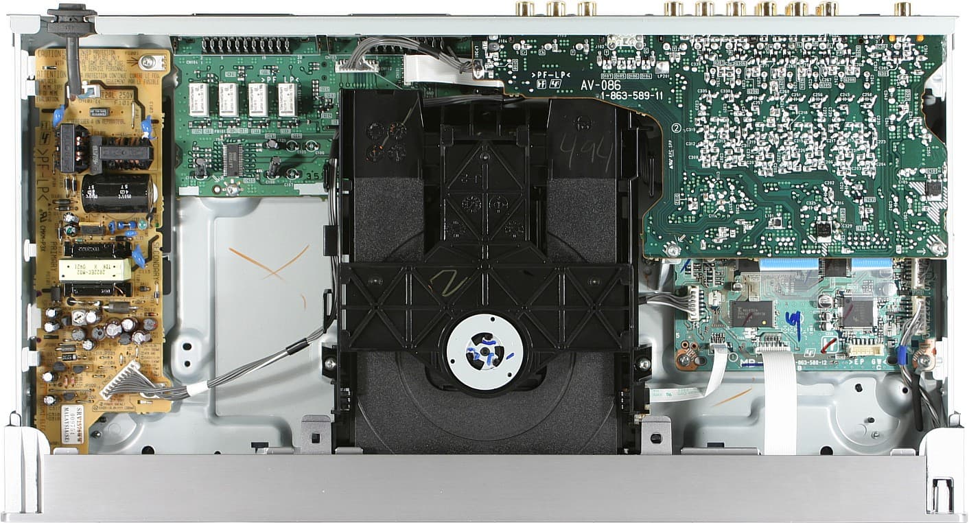 осуществляющий декодирование потоков, и, видимо, преобразование цифровых видеосигналов в аналоговый вид. За аналоговый звук отвечает аудиоЦАП AK4358 (192 кГц/24 бит, THD+N = -94 дБ, S/N = 112 дБ). Усиливают аналоговые аудиосигналы двухканальные операционные усилители BA15532F (ROHM), 4 штуки которых расположены на вспомогательной плате. Там же находится большое количество развязывающих конденсаторов и 6-ти канальный видеоусилитель NJM2587.