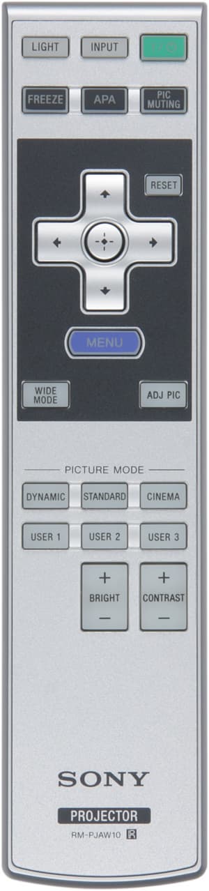 В отличие от многих проекторов аналогичного генезиса этот проектор оснащен не пультом от офисного эквивалента, а полноценным и полноразмерным пультом, аналогичным тому, что входит в комплектацию к старшим Full HD моделям от Sony. Пульт изготовлен из пластика светло-серого снизу и с серебристым покрытием на верхней половине корпуса. Дизайн выполнен в фирменном стиле, включая продольную ребристость на нижней поверхности. Пульт удобно лежит в руке. Кнопок не очень много, самые нужные, включая навигационные и две кнопки-качалки, легко находятся на ощупь. Есть достаточно яркая оранжевая светодиодная подсветка всех кнопок, кроме трех в первом ряду, которые фосфоресцируют. Включается подсветка кнопкой LIGHT.