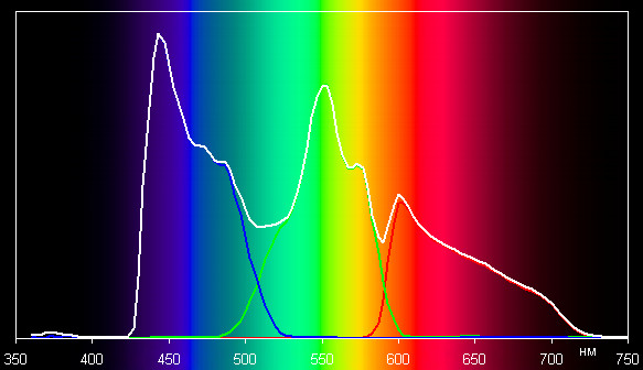 Ниже приведены спектры для белого поля (белая линия), наложенные на спектры красного, зеленого и синего полей (линии соответствующих цветов):