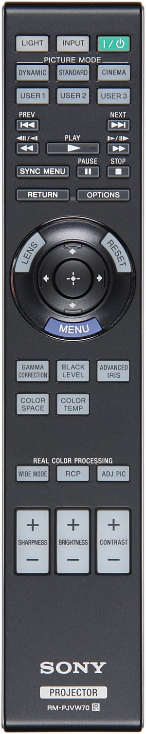Теперь пульт больше соответствует проектору, так как стал черным. За исключением отсутствия двух кнопок этот пульт ничем не отличается от пульта к Sony VPL-VW80. Дизайн выполнен в фирменном стиле, включая ребристость на нижней поверхности. По бокам — вставки из пластика с серебристым покрытием. Пульт удобно лежит в руке. Кнопок много (из-за кнопок управления плеером), однако самые нужные, включая группу с навигационной четырехпозиционной кнопкой в центре и три кнопки-качалки для быстрого изменения самых важных настроек изображения, легко находятся на ощупь. Есть достаточно яркая синяя светодиодная подсветка всех кнопок, кроме трех в первом ряду, которые фосфоресцируют.