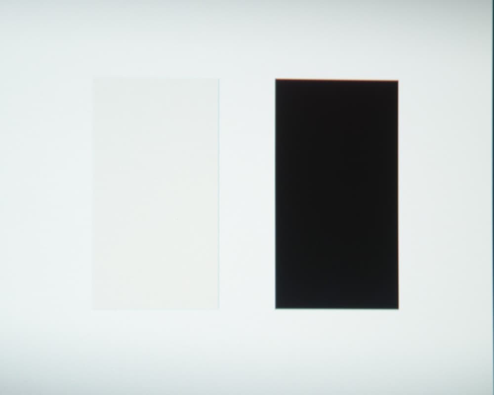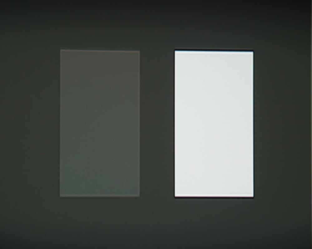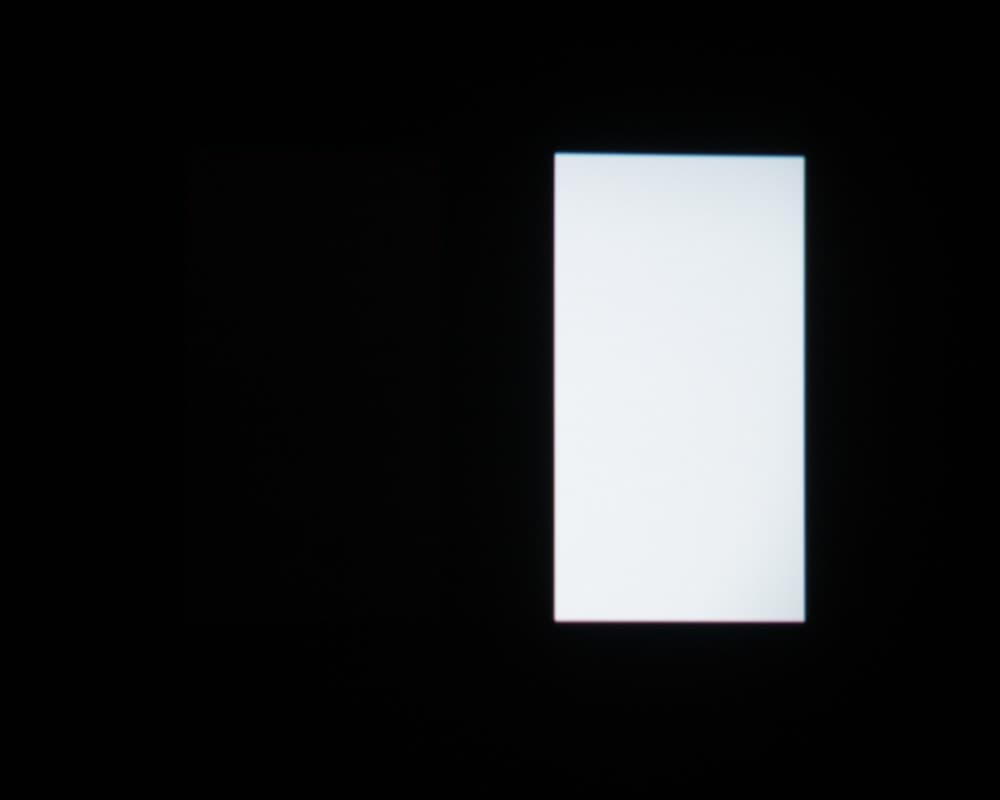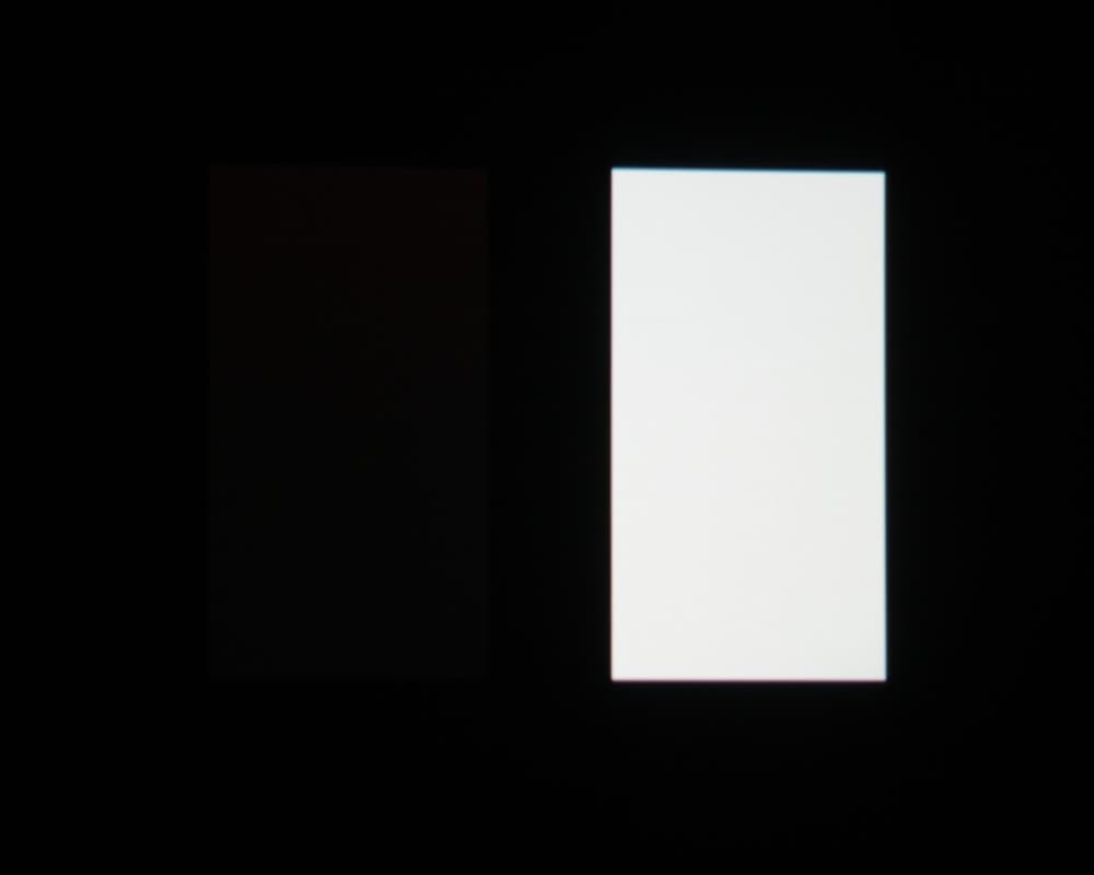 Видно, что разделение белого на черном близко к идеальному, разделение черного на белом очень хорошее, в случае серого на сером перекрестная помеха присутствует. При уменьшении Яркость 3D-очков на одну ступень разделение белого на черном улучшается на столько, что заметить «паразитный» прямоугольник можно только подрегулировав контраст в тенях на фотографии: