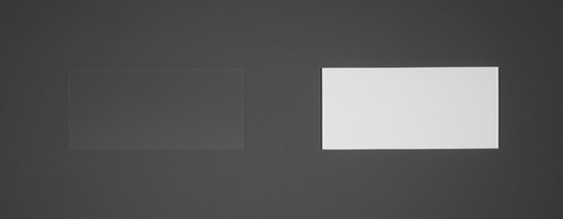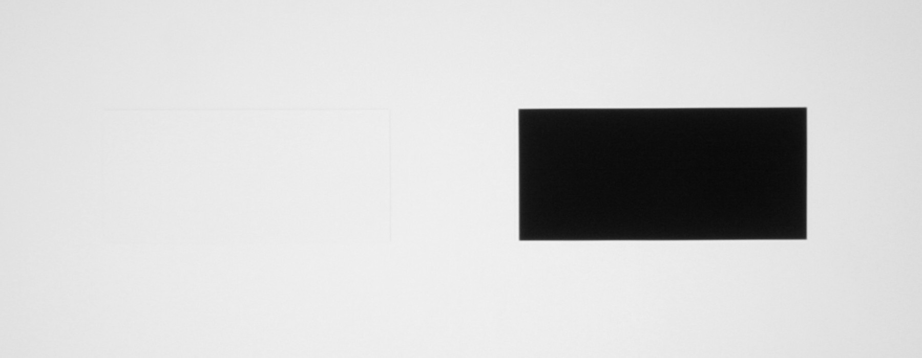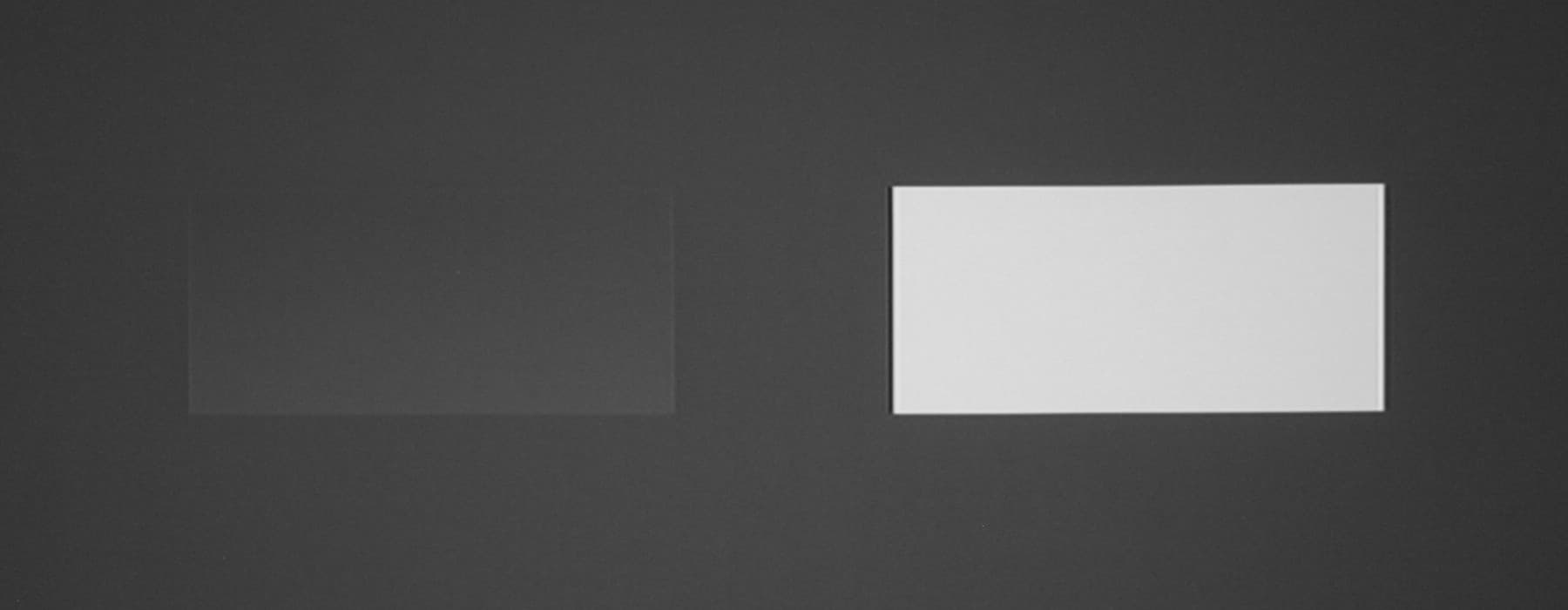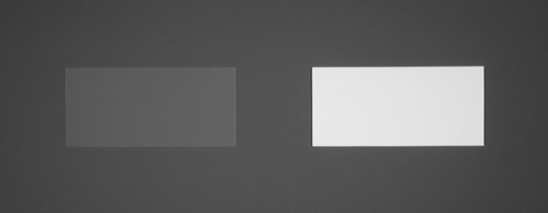 Для тестирования эффективности разделения для глаз мы вывели три тестовых изображения с черным прямоугольником на белом фоне, с белым прямоугольником на черном фоне и со светло серым прямоугольником на темно-сером фоне. В стереопарах прямоугольники были смещены относительно друг друга, поэтому при просмотре через очки при 100%-ном разделении можно было бы видеть только один прямоугольник. Фотографии ниже сделаны через очки при сигнале 60 кадр/с, при этом экспозиция подбиралась так, чтобы белое поле на фотографиях было максимально ярким, но еще не пересвеченным. Яркость 3D-очков установлена на максимальное, среднее и на минимальное значение:
