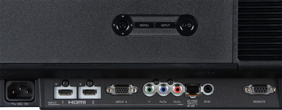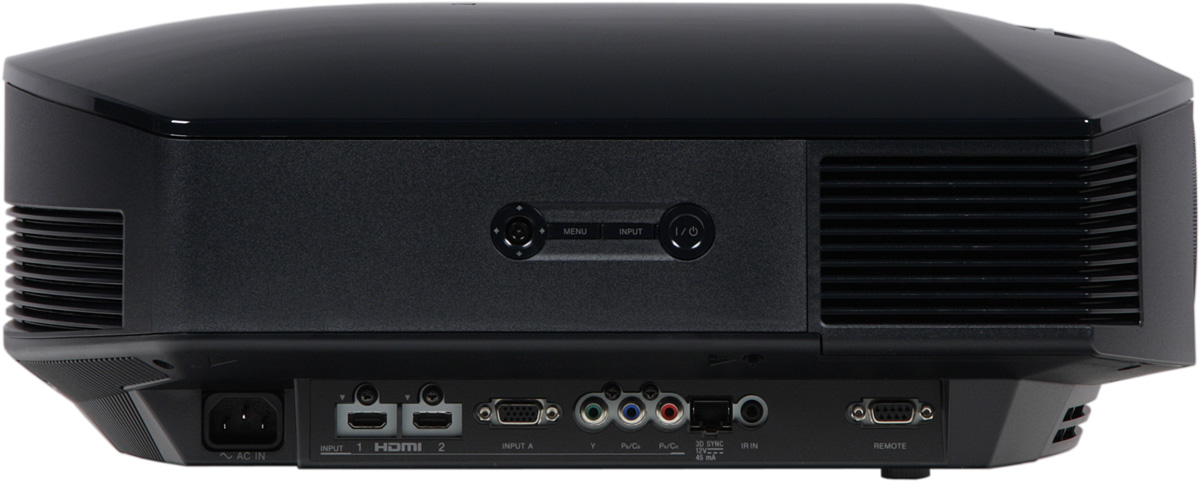 Проектор оснащен двумя HDMI-, VGA- и компонентным входами. Переключение между источниками осуществляется перебором всех с помощью кнопки Input на корпусе проектора или на пульте. При этом если включена функция автопоиска, то проектор автоматически пропускает неактивные входы. Гнездо миниджек предназначено для подключения внешнего ИК-приемника. Заявлена ограниченная поддержка управления по HDMI — проектор может автоматически включаться при включении (запуске на воспроизведение) подключенного по HDMI-оборудования, наоборот, выключать подключенное оборудование при выключении. Разъем RJ45 предназначен для подключения внешнего излучателя сигналов синхронизации затворных очков. Смысл в том, что пользователь может использовать доступные сетевые кабели нужной длины и стандартные разъемы для подключения опционального излучателя TMR-PJ2. Впрочем, с большой вероятностью он не потребуется, так как в проектор встроен излучатель сигналов синхронизации (если смотреть на фронтальную панель, то неприметное окошко излучателя можно увидеть внизу справа). Интерфейс RS-232C, по всей видимости, предназначен для удаленного управления, обновления прошивки и для загрузки пользовательских кривых гамма-коррекции с помощью программы ImageDirector3 (ее можно найти на сайте производителя).