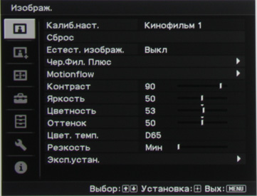 В данном проекторе есть две функции, благодаря которым повышается четкость в движении, — вставка черного кадра и вставка промежуточного кадра. Вторая функция также повышает и плавность движения. Заметим, что обе эти функции могут работать одновременно. За вставку черного кадра отвечает функция Проекц. Кино. При ее включении немного повышается четкость в движении, но и появляется заметное мерцание изображения.