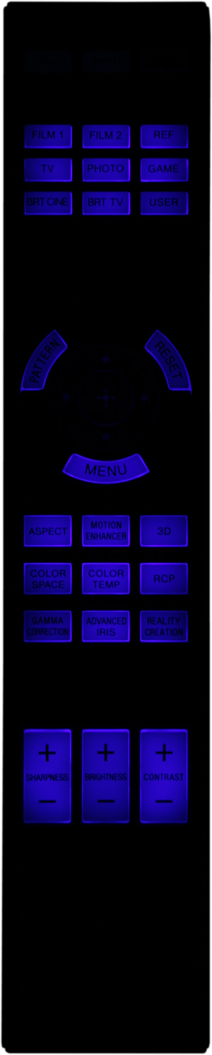 Дизайн выполнен в фирменном стиле, включая ребристость на нижней поверхности. Корпус пульта изготовлен из черного пластика с матовой поверхностью. По бокам — вставки из пластика с серебристым покрытием. Пульт удобно лежит в руке. Кнопок немного, самые нужные, включая группу с навигационной четырехпозиционной кнопкой в центре и три кнопки-качалки для быстрого изменения самых важных настроек изображения, легко находятся на ощупь. Есть равномерная и достаточно яркая синяя светодиодная подсветка всех кнопок, кроме трех в первом ряду, которые фосфоресцируют.