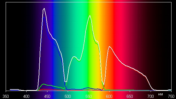 Видно, что компоненты хорошо разделены, и это позволяет получить широкий цветовой охват, а для его приведения к стандарту sRGB выполняется перекрестное подмешивание компонент.