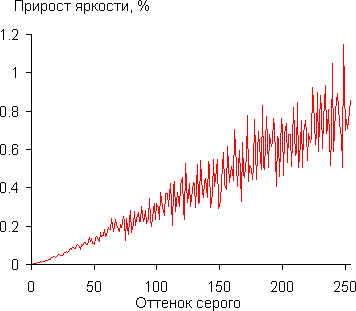 Для оценки характера роста яркости на шкале серого мы измерили яркость 256-ти оттенков серого (от 0, 0, 0 до 255, 255, 255). График ниже показывает прирост (не абсолютное значение!) яркости между соседними полутонами при Контраст = 82 и Яркость = 52.