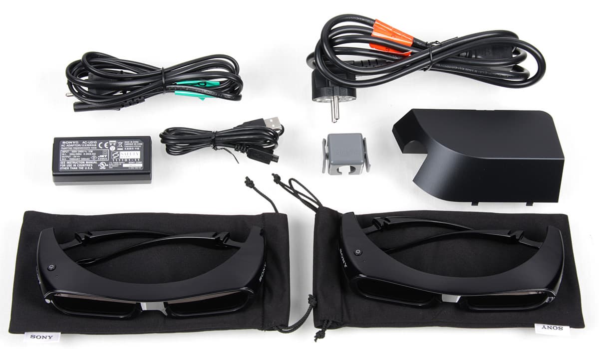 В комплект поставки этого проектора входят две пары очков TDG-PJ1. Очки имеют элегантный дизайн, их комфортно носить даже с корректирующими очками, угол обзора в них достаточно большой, очки охватывают голову гибкими дужками и подходят для небольших и больших голов. Правда, по современным мерками очки немного тяжеловаты — 59 г. К очкам прилагается мягкий чехол, предназначенный для хранения очков. Работают очки от встроенного аккумулятора. На полную зарядку нужно 30 мин, а от одной зарядки очки работают 30 часов. 3 минуты подзарядки обеспечивают 3 часа работы (данные производителя). Для зарядки используется кабель (1,2 м) с разъемами Micro-USB и USB типа A. Первый разъем подключается к разъему на очках под заглушкой, второй — к БП или порту на компьютере. При работе очки не заряжаются. В комплект поставки проектора входит небольшой БП с розеткой USB, предназначенный для зарядки очков. Синхронизируются очки по ИК-сигналу от проектора, приемник расположен по центру между стеклами. Включаются очки кнопочкой сверху, выключаются — через несколько минут отсутствия приема синхросигнала.