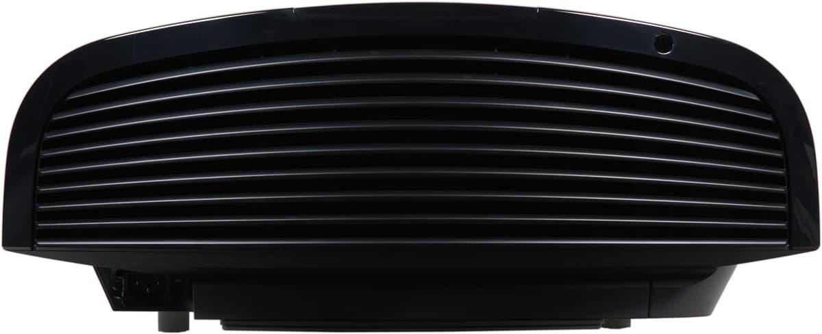 При настольном размещении подключаться к этим разъемам очень неудобно, зато при потолочном размещении отходящие кабели будут заслонены корпусом проектора, а значит, кабельная крышка в принципе не понадобится. Разъем питания также расположен на уступе днища в заднем левом углу. К проектору прилагается специальный фиксатор кабеля питания и декоративная крышечка, закрывающая отсек разъема питания. ИК-приемников два — спереди (за передней панелью) и сзади (круглое окошечко справа вверху). Проектор оснащен двумя передними вывинчивающимися из корпуса (примерно на 20 мм, стальные стойки) ножками, позволяющими устранить небольшой перекос и/или немного приподнять переднюю часть проектора при его размещении на горизонтальной поверхности. Для крепления к потолочному кронштейну в днище проектора вделаны 3 металлические втулки с резьбой. Воздух для охлаждения внутренностей забирается через решетку вокруг объектива и через многочисленные решетки на днище, а выдувается назад через решетку на задней панели. Отметим, что тип используемых матриц позволил создать герметичную оптическую систему и отказаться от использования воздушного фильтра.