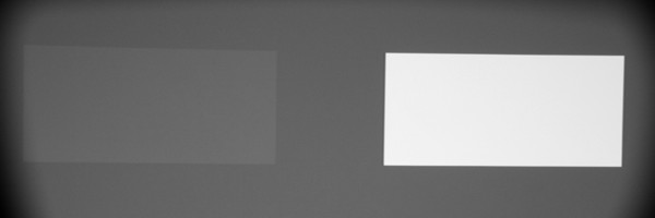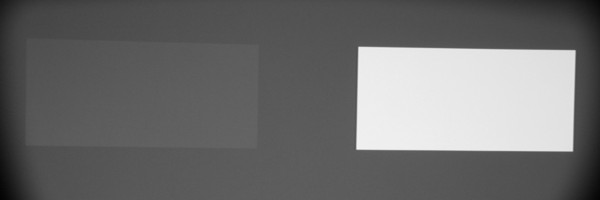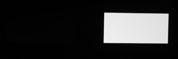 Для тестирования эффективности разделения для глаз мы вывели три тестовых изображения с черным прямоугольником на белом фоне, с белым прямоугольником на черном фоне и со светло-серым прямоугольником на темно-сером фоне. В стереопарах прямоугольники были смещены относительно друг друга, поэтому при просмотре через очки при 100%-ном разделении можно было бы видеть только один прямоугольник. Фотографии ниже сделаны через очки при сигнале 60 кадр/с, при этом экспозиция подбиралась так, чтобы белое поле на фотографиях было максимально ярким, но еще не пересвеченным. Параметр Яркость 3D-очков установлен на высокое и стандартное значение: