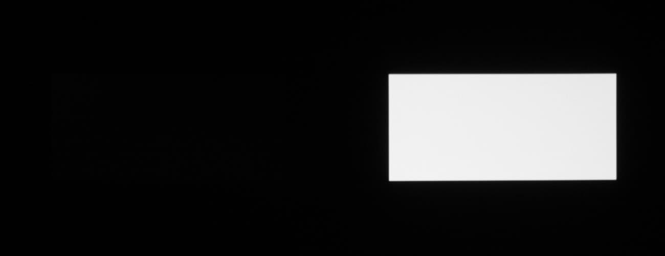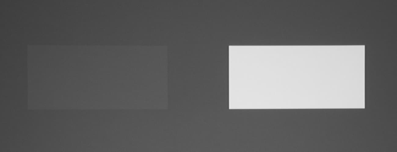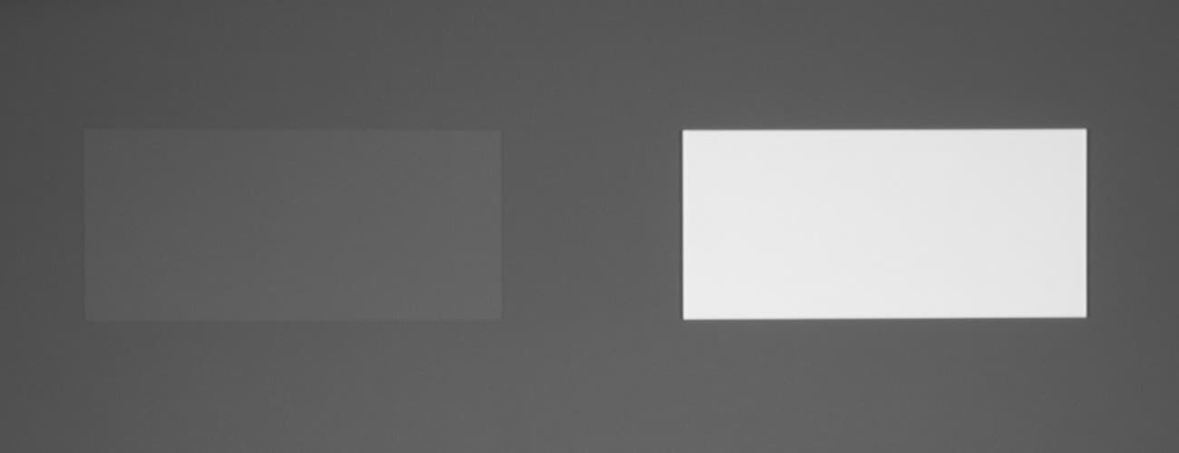 Для тестирования эффективности разделения для глаз мы вывели три тестовых изображения с черным прямоугольником на белом фоне, с белым прямоугольником на черном фоне и со светло-серым прямоугольником на темно-сером фоне. В стереопарах прямоугольники были смещены относительно друг друга, поэтому при просмотре через очки при 100% разделении можно было бы видеть только один прямоугольник. Фотографии ниже сделаны через очки при сигнале 60 кадр/с, при этом экспозиция подбиралась так, чтобы белое поле на фотографиях было максимально ярким, но еще не пересвеченным. Параметр Яркость 3D установлен высокое и стандартное значение: