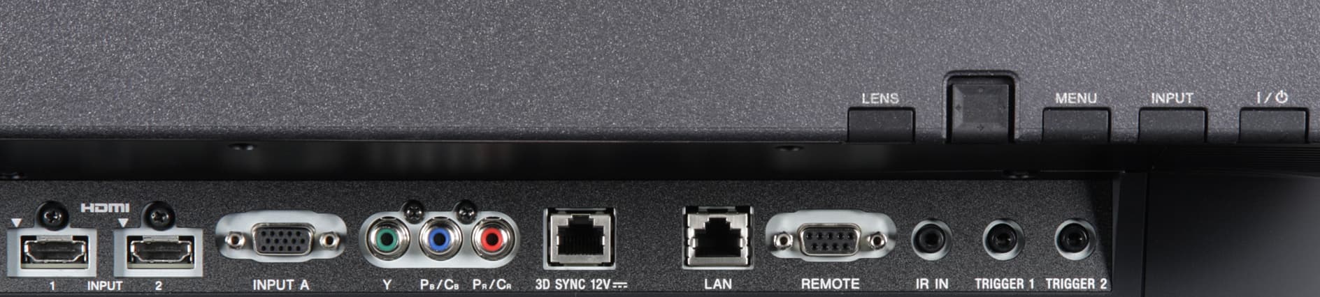 Видеовходов четыре — два аналоговых и два HDMI. Переключение между источниками осуществляется перебором всех с помощью кнопки Input на корпусе проектора или на пульте. При этом если включена функция автопоиска, то проектор автоматически пропускает неактивные входы. Экран с электромеханическим приводом и привод анаморфотного объектива-насадки можно подключать к выходам Trigger 1/2. Режим работы этих выходов устанавливается в меню. Третье гнездо миниджек предназначено для подключения внешнего ИК-приемника. Заявлена поддержка управления по HDMI — проектор может автоматически включаться при включении (запуске на воспроизведение) подключенного по HDMI-оборудования, наоборот, выключать подключенное оборудование при выключении. Штатное предназначение интерфейса RS-232C — это загрузка пользовательских кривых гамма-коррекции с помощью программы ImageDirector3 (ее можно загрузить с сайта компании). Разъемов RJ45 два, один предназначен для подключения к сети передачи данных,