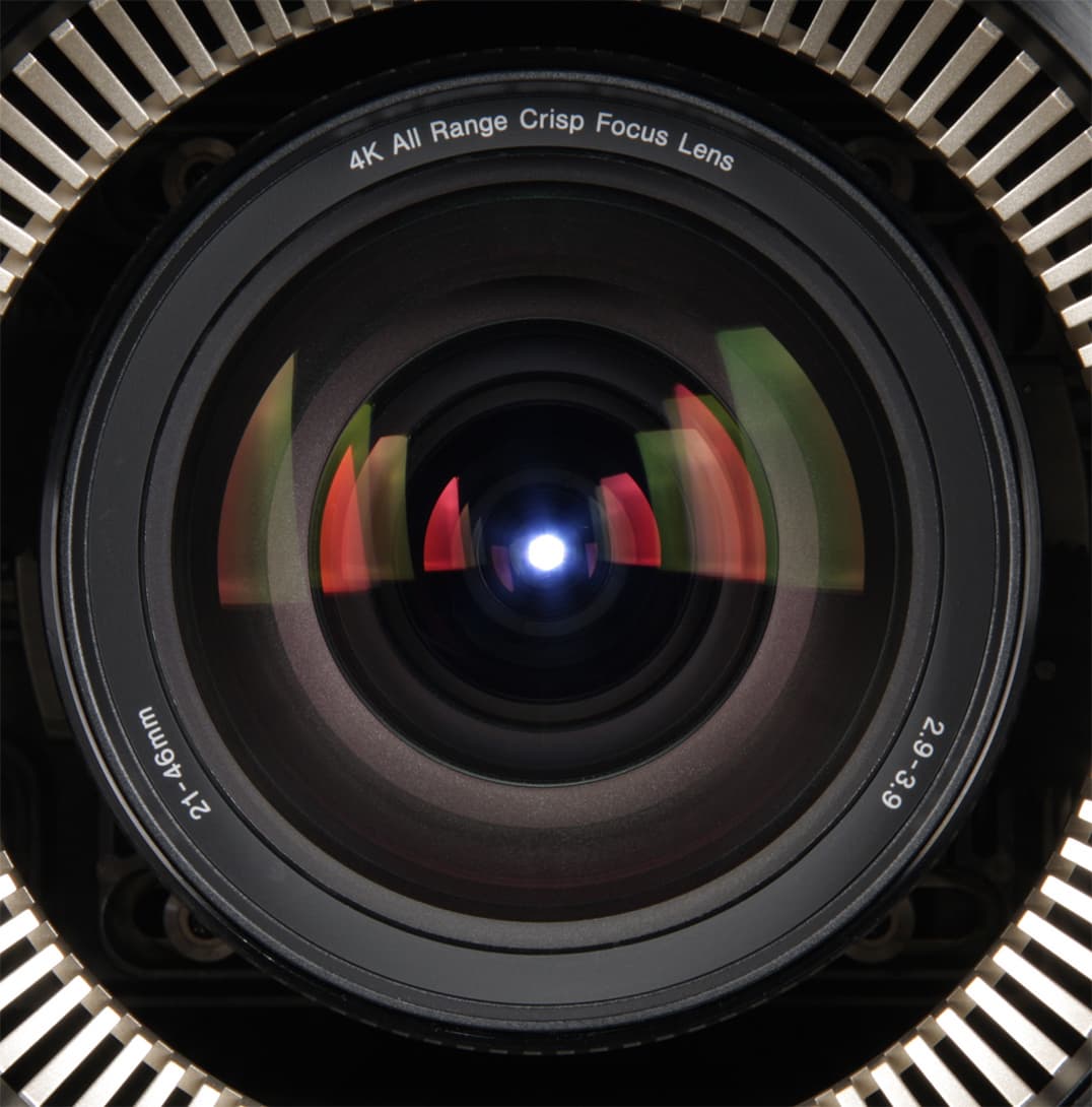 Есть функция ручной цифровой коррекции вертикальных трапецеидальных искажений. Объектив имеет сложную конструкцию и очень высокое качество изготовления. Так как перепады температуры могут ухудшать оптические свойства объектива, конструкция проектора предусматривает фронтальный забор воздуха и принудительное охлаждение объектива, чтобы он оставался примерно при комнатной температуре. При этом вентиляционная решетка вокруг объектива направляет поток воздуха так, что траектория пылинок резко уходит в стороны при приближении к фронтальной линзе объектива.